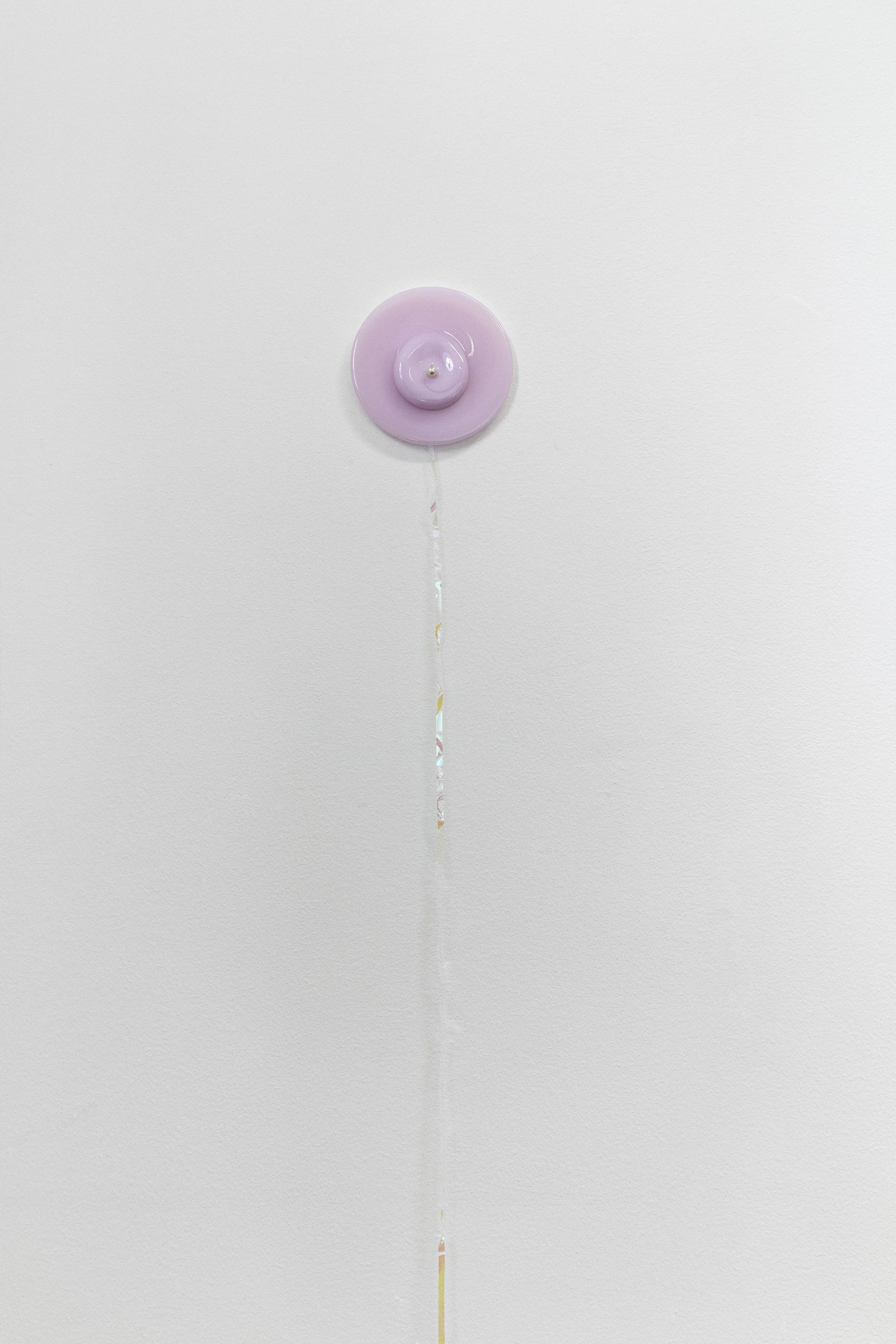 Blown and slumped glass, imitation pearl, iridescent streamer pooled on the floor, light